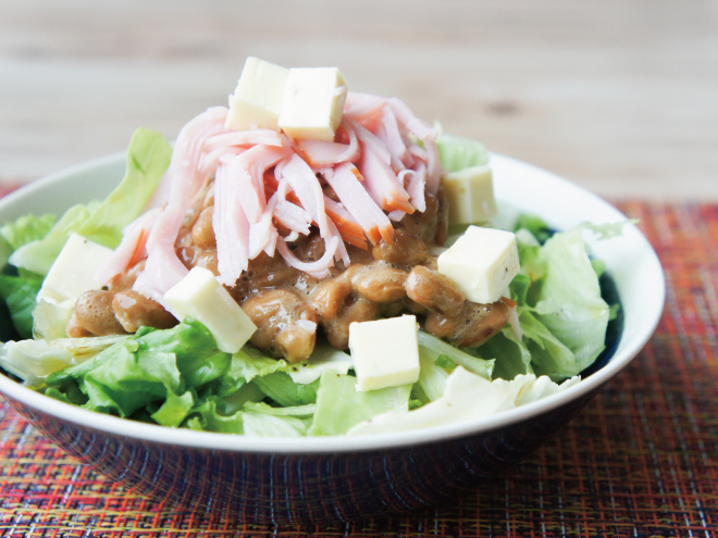 ハム納豆焦がしにんにくチーズサラダ 材料納豆(丹念納豆)、レタス、キャベツ、ハム、焦がしにんにく&ねぎ油風味チーズ、オリーブオイル、粗挽き塩こしょう、ポン酢ハム納豆焦がしにんにくチーズサラダの作り方①レタスとキャベツは、食べやすい大きさに切ったら、器に盛りつけます。②オリーブオイル、粗挽き塩こしょう、ポン酢、よく混ぜた納豆をかけます。③ハムと焦がしにんにく&ねぎ油風味チーズを切ったら、サラダにかけて完成です。