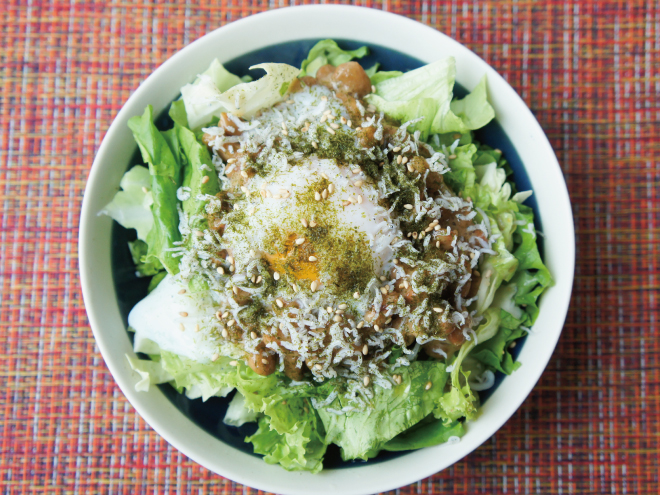 青のり温玉じゃこ納豆サラダ 材料納豆(丹念納豆)、レタス、キャベツ、温泉卵、ちりめんじゃこ、青のり、いりごま、オリーブオイル、粗挽き塩こしょう、ポン酢青のり温玉じゃこ納豆サラダの作り方①レタスとキャベツは、食べやすい大きさに切ったら、器に盛りつけます。②オリーブオイル、粗挽き塩こしょう、ポン酢、よく混ぜた納豆をかけます。③温泉卵をのせて、ちりめんじゃこ、青のり、いりごまをかけたら完成です。