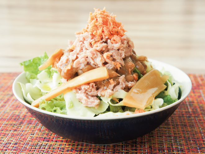 鮭シーチキン納豆メンマサラダ 材料納豆(丹念納豆)、レタス、キャベツ、シーチキン、シャケフレーク、メンマ、オリーブオイル、粗挽き塩こしょう鮭シーチキン納豆メンマサラダの作り方①レタスとキャベツは、食べやすい大きさに切ったら、器に盛りつけます。②オリーブオイル、粗挽き塩こしょう、よく混ぜた納豆をかけます。③シーチキン、シャケフレークをかけて、メンマをのせたら完成です。