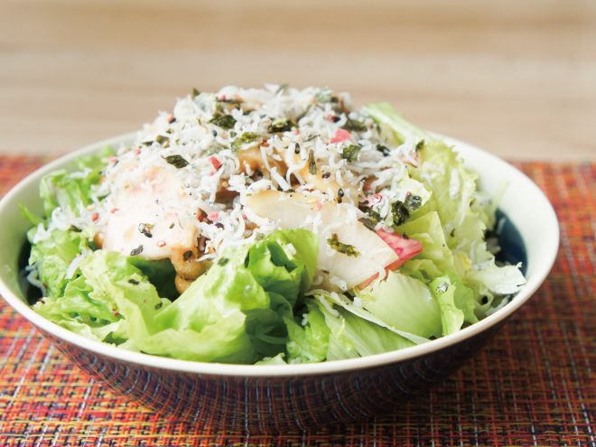 納豆(丹念納豆)、レタス、キャベツ、かぶ、塩、かつおぶし、醤油、ちりめんじゃこ、梅ふりかけ、オリーブオイル、粗挽き塩こしょう