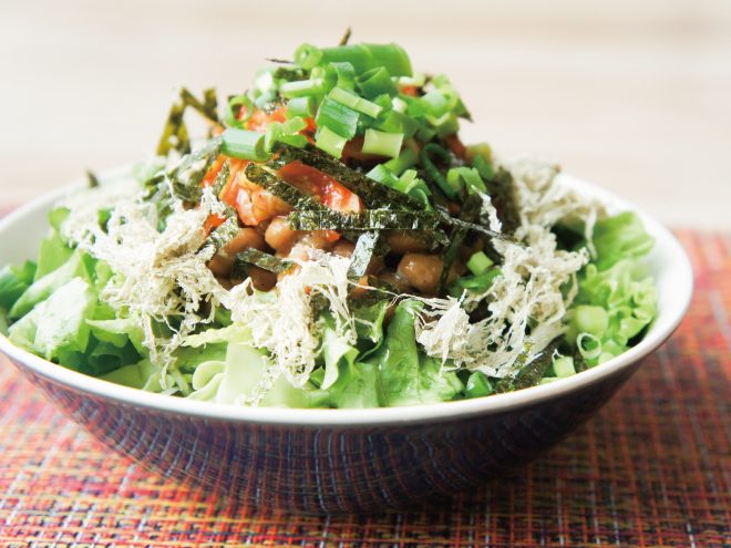 刻み海苔ねぎキムチ納豆とろろ昆布サラダ 材料納豆(丹念納豆)、レタス、キャベツ、キムチ、刻み海苔、ねぎ、とろろ昆布、オリーブオイル刻み海苔ねぎキムチ納豆とろろ昆布サラダの作り方①レタスとキャベツは、食べやすい大きさに切ったら、器に盛りつけます。②オリーブオイル、よく混ぜた納豆をかけます。③キムチ、刻み海苔、ねぎ、とろろ昆布をかけたら完成です。