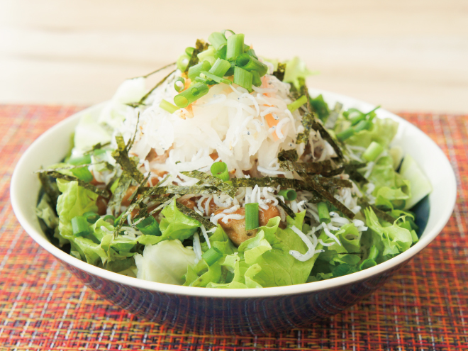 ③なますをのせたら、ちりめんじゃこ、刻みねぎ、刻み海苔を散らして完成です。