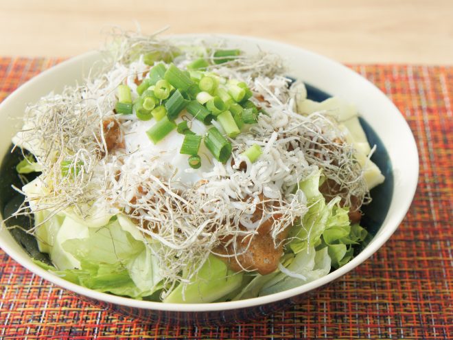 納豆温玉ねぎ昆布じゃこサラダの作り方