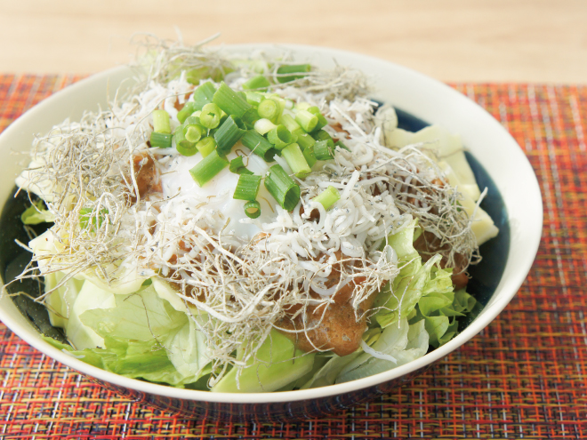 納豆(丹念納豆)、レタス、キャベツ、温泉卵、ねぎ、ちりめんじゃこ、ふりかけ昆布、オリーブオイル、粗挽き塩こしょう