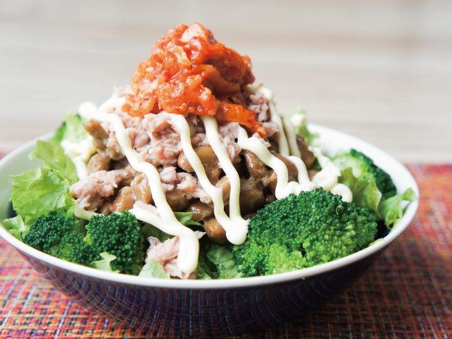ツナマヨ納豆サーモンハラスユッケサラダ 材料納豆(丹念納豆)、レタス、キャベツ、ブロッコリー、シーチキン、サーモンハラスユッケ、マヨネーズ、オリーブオイル、粗挽き塩こしょう、塩ツナマヨ納豆サーモンハラスユッケサラダの作り方①ブロッコリーを塩茹でしたら、水気を切っておきます。②レタスとキャベツは、食べやすい大きさに切ったら、器に盛りつけます。③ブロッコリーを盛りつけたら、オリーブオイル、粗挽き塩こしょう、よく混ぜた納豆をかけます。④シーチキンをのせたら、マヨネーズをかけます。⑤サーモンハラスユッケをのせて完成です。