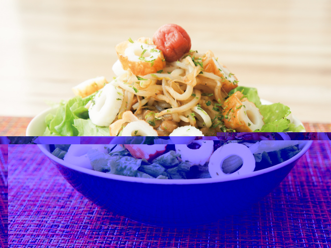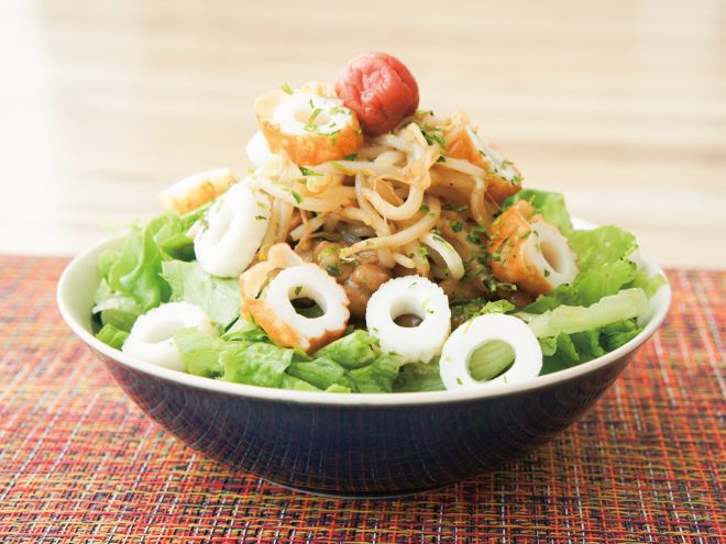 納豆(丹念納豆)、レタス、キャベツ、もやし、小松菜、バター、ポン酢、香味シャンタン、粗挽き塩コショウ、オリーブオイル、ちくわ、青のり、梅