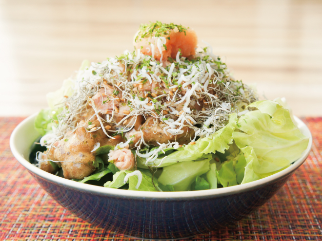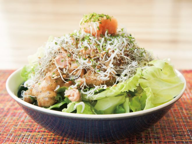 明太じゃこ青のり昆布納豆シーチキンサラダ 材料納豆(丹念納豆)、レタス、キャベツ、シーチキン、昆布ふりかけ、金ごま、明太子、ちりめんじゃこ、青のり、オリーブオイル、粗挽き塩こしょう明太じゃこ青のり昆布納豆シーチキンサラダの作り方①レタスとキャベツは、食べやすい大きさに切ったら、器に盛りつけます。②オリーブオイル、粗挽き塩こしょう、よく混ぜた納豆をかけます。③シーチキン、昆布ふりかけ、金ごまをかけたら、明太子をのせます。④ちりめんじゃこ、青のりをかけて完成です。