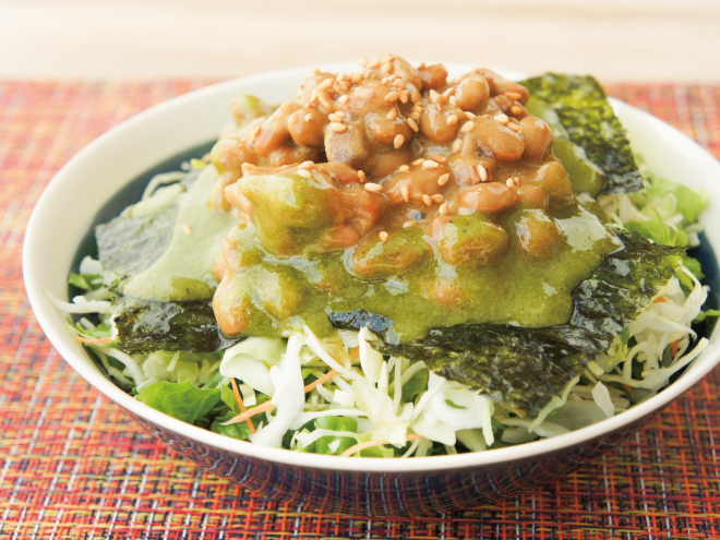 韓国海苔とルッコラしらす納豆サラダ 材料納豆(丹念納豆)、リーフレタス、キャベツ、水菜、にんじん、しらす、韓国海苔、ルッコラドレッシング、金ごま、オリーブオイル韓国海苔とルッコラしらす納豆サラダの作り方①キャベツ、にんじんは千切りにします。②リーフレタスと水菜は食べやすい大きさに切り、キャベツ、にんじん、しらすと混ぜ合わせたら器に盛りつけます。③オリーブオイルをかけたら、韓国海苔をのせます。④よく混ぜた納豆をかけたら、ルッコラドレッシング、金ごまをかけて完成です。