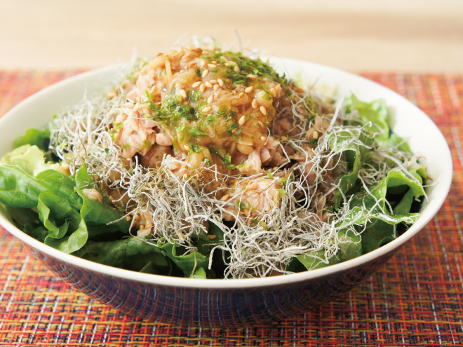 青のり昆布なめ茸納豆シーチキンサラダ 材料納豆(丹念納豆)、レタス、キャベツ、シーチキン、なめ茸、昆布ふりかけ、青のり、ごま、レモン果汁、オリーブオイル、粗挽き塩こしょう青のり昆布なめ茸納豆シーチキンサラダの作り方①レタスとキャベツは、食べやすい大きさに切ったら、器に盛りつけます。②オリーブオイル、粗挽き塩こしょう、よく混ぜた納豆をかけます。③シーチキン、なめ茸、昆布ふりかけ、青のり、ごま、レモン果汁をかけたら完成です。