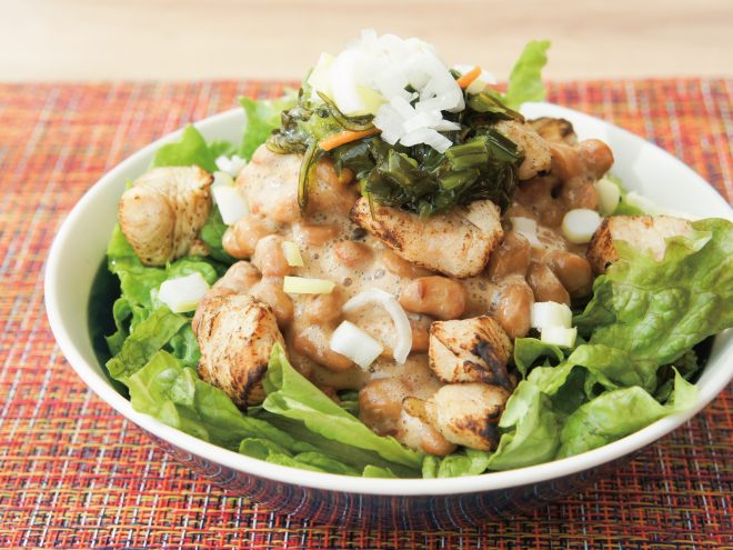 納豆(丹念納豆)、レタス、キャベツ、むね肉炭火焼き、わさび野沢菜こんぶの佃煮、白ネギ、オリーブオイル、粗挽き塩こしょう