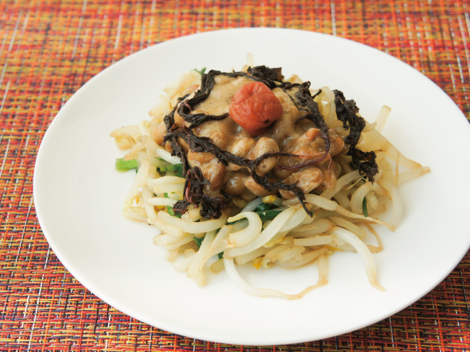 納豆(丹念納豆)、もやし、ニラ、ウスターソース、香味シャンタン、粗びき塩こしょう、しそ、梅