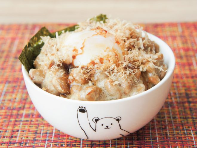 ②よく混ぜた納豆をかけたら、真ん中にくぼみをつくって、温泉卵をのせます。