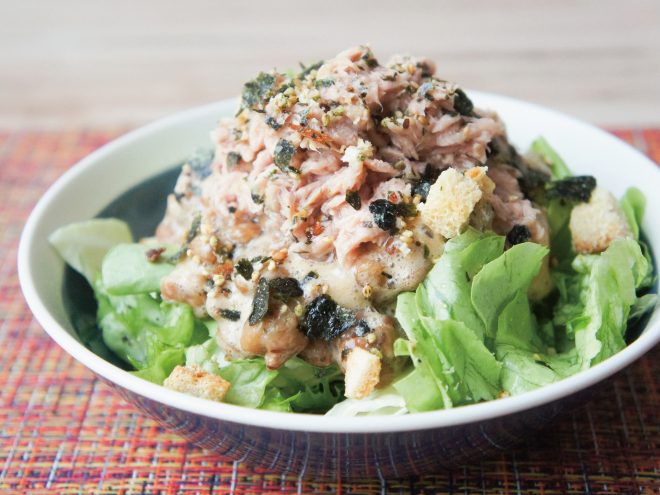韓国のりクルトン納豆シーチキンサラダ 材料納豆(丹念納豆)、レタス、キャベツ、シーチキン、クルトン、韓国海苔ふりかけ、オリーブオイル、粗挽き塩こしょう韓国のりクルトン納豆シーチキンサラダの作り方①レタスとキャベツは、食べやすい大きさに切ったら、器に盛りつけます。②オリーブオイル、粗挽き塩こしょう、よく混ぜた納豆をかけます。③シーチキン、クルトン、韓国海苔ふりかけをかけたら完成です。