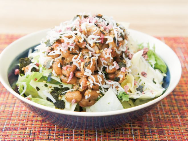 梅ジャコ韓国のり納豆サラダ 材料納豆(丹念納豆)、レタス、キャベツ、韓国のりふりかけ、ちりめんじゃこ、梅ふりかけ、オリーブオイル梅ジャコ韓国のり納豆サラダの作り方①レタスとキャベツは、食べやすい大きさに切ったら、器に盛りつけます。②オリーブオイル、よく混ぜた納豆をかけます。③韓国のりふりかけ、ちりめんじゃこ、梅ふりかけをかけたら完成です。