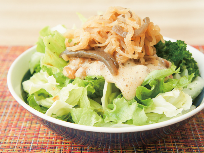 納豆(丹念納豆)、レタス、キャベツ、ブロッコリー、切り干し大根の煮物、ポン酢、オリーブオイル、粗挽き塩こしょう、塩