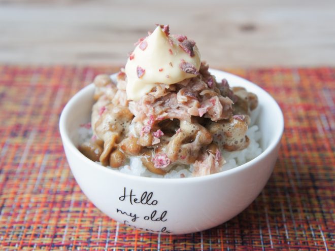 ツナマヨ納豆梅ご飯 材料納豆(丹念納豆)、シーチキン、マヨネーズ、カリカリ梅ふりかけ、ご飯ツナマヨ納豆梅ご飯の作り方①お茶碗にご飯をついだら、よく混ぜた納豆をかけます。②シーチキン、マヨネーズ、カリカリ梅ふりかけをかけたら完成です。