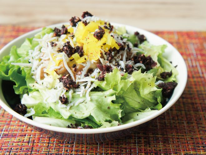 梅ちりめん沢庵納豆サラダ 材料納豆(丹念納豆)、レタス、キャベツ、たくあん、ちりめんじゃこ、カリカリ梅ふりかけ、万能スパイス、オリーブオイル梅ちりめん沢庵納豆サラダの作り方①レタスとキャベツは、食べやすい大きさに切ったら、器に盛りつけます。②オリーブオイル、よく混ぜた納豆をかけます。③細かく刻んだたくあんをのせたら、ちりめんじゃこ、カリカリ梅ふりかけ、万能スパイスをかけて完成です。