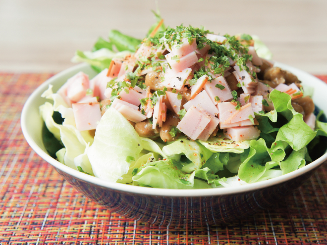 納豆(丹念納豆)、レタス、キャベツ、ハム、万能スパイス、青のり、オリーブオイル、粗挽き塩コショウ