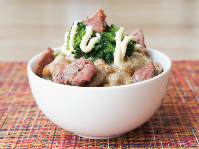 スモーク砂肝とマヨブロ納豆ご飯 材料納豆(丹念納豆)、ブロッコリー、スモーク砂肝、マヨネーズ、塩、ご飯スモーク砂肝とマヨブロ納豆ご飯の作り方①ブロッコリーは、塩ゆでして水気を切っておきます。②お茶碗にご飯をついだら、よく混ぜた納豆をかけます。③ブロッコリーをのせたら、スモーク砂肝とマヨネーズをかけて完成です。
