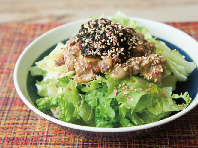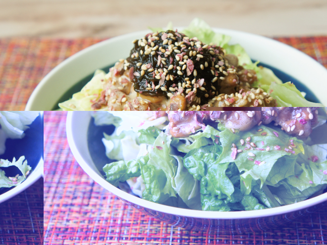 カリカリ梅納豆もずく胡麻サラダ 材料納豆(丹念納豆)、レタス、キャベツ、もずく、いりごま、カリカリ梅ふりかけ、オリーブオイル、ポン酢カリカリ梅納豆もずく胡麻サラダの作り方①レタスとキャベツは、食べやすい大きさに切ったら、器に盛りつけます。②オリーブオイル、ポン酢、よく混ぜた納豆をかけます。③もずく、いりごま、カリカリ梅ふりかけをかけたら完成です。