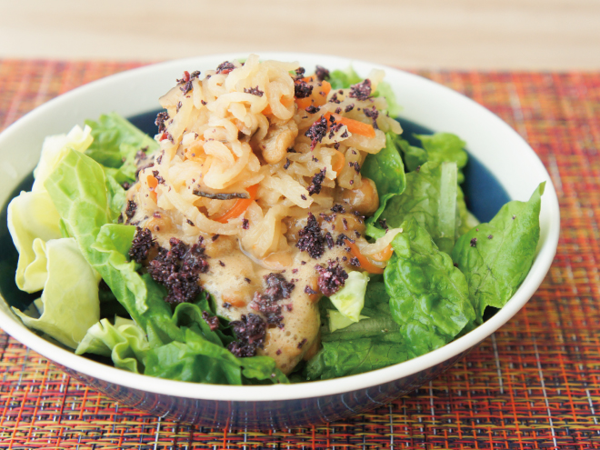 梅しそ納豆切り干し大根サラダ 材料納豆(丹念納豆)、レタス、キャベツ、切り干し大根、梅しそふりかけ、オリーブオイル、粗挽き塩コショウ梅しそ納豆切り干し大根サラダの作り方①レタスとキャベツは、食べやすい大きさに切ったら、器に盛りつけます。②オリーブオイル、粗挽き塩コショウ、よく混ぜた納豆をかけます。③切り干し大根をのせたら、梅しそふりかけをかけて完成です。