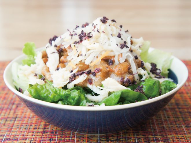 納豆(丹念納豆)、レタス、キャベツ、日向夏なます、蒸し鶏、しそ梅ふりかけ、オリーブオイル