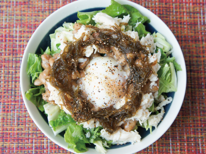 もずく温玉スパイス納豆蒸し鶏サラダ 材料納豆(丹念納豆)、レタス、キャベツ、温泉卵、蒸し鶏、もずく、万能スパイス、オリーブオイルもずく温玉スパイス納豆蒸し鶏サラダの作り方①レタスとキャベツは、食べやすい大きさに切ったら、器に盛りつけます。②オリーブオイル、よく混ぜた納豆をかけます。③温泉卵をのせたら、蒸し鶏を散らします。④もずく、万能スパイスをかけたら完成です。