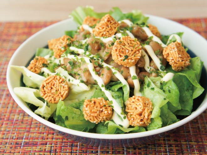 青のりマヨ納豆ベビースター丸サラダ 材料納豆(丹念納豆)、レタス、キャベツ、ベビースター丸、マヨネーズ、青のり、オリーブオイル、粗挽き塩コショウ青のりマヨ納豆ベビースター丸サラダの作り方①レタスとキャベツは、食べやすい大きさに切ったら、器に盛りつけます。②オリーブオイル、粗挽き塩コショウ、よく混ぜた納豆をかけます。③ベビースター丸をのせたら、マヨネーズ、青のりをかけて完成です。