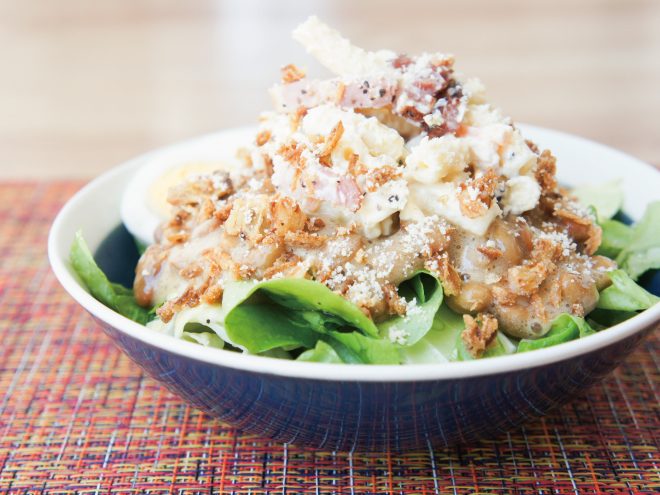 納豆(丹念納豆)、レタス、キャベツ、ベーコンマカロニサラダ、フライドオニオン、粉チーズ、オリーブオイル