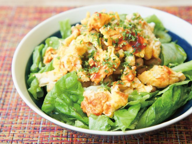 青のりゆずスクランブルエッグ納豆サラダ 材料納豆(丹念納豆)、レタス、キャベツ、卵、ケチャップ、青のり、ゆずふりかけ、オリーブオイル、ポン酢青のりゆずスクランブルエッグ納豆サラダの作り方①スクランブルエッグをつくったら、ケッチャプをかけます。②レタスとキャベツは、食べやすい大きさに切ったら、器に盛りつけます。③オリーブオイル、ポン酢、よく混ぜた納豆をかけます。④スクランブルエッグをのせたら、青のり、ゆずふりかけをかけて完成です。