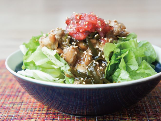納豆(丹念納豆)、レタス、キャベツ、子持ちメカブ、梅くらげ、いりごま、オリーブオイル、粗挽き塩コショウ