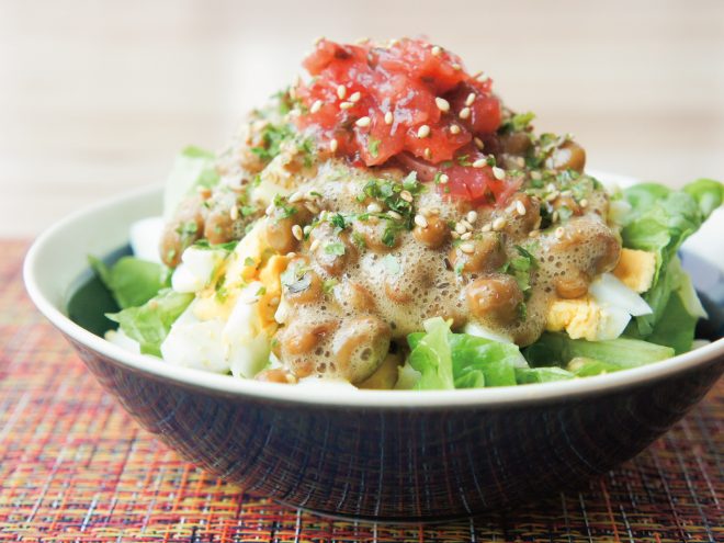梅くらげ青のり納豆ゆで卵サラダ 材料納豆(丹念納豆)、レタス、キャベツ、ゆで卵、梅くらげ、青のり、いりごま、オリーブオイル、ポン酢梅くらげ青のり納豆ゆで卵サラダの作り方①レタスとキャベツは、食べやすい大きさに切ったら、器に盛りつけます。②オリーブオイル、ポン酢、切ったゆで卵、よく混ぜた納豆をかけます。③梅くらげ、青のり、いりごまをかけたら完成です。