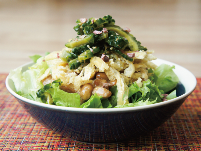 納豆(丹念納豆)、ゴーヤ、塩、酢、砂糖、薄口醤油、濃口醤油、塩昆布、白ごま、レタス、キャベツ、刻み揚げ、カリカリ梅ふりかけ、ポン酢、オリーブオイル