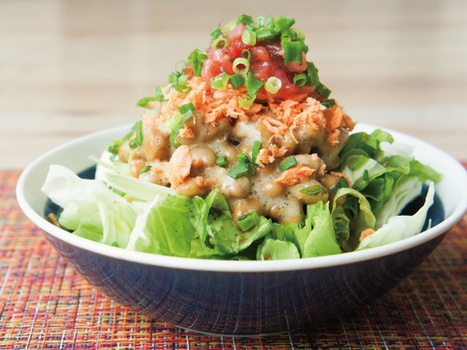 納豆(丹念納豆)、レタス、キャベツ、シャケフレーク、梅クラゲ、ねぎ、オリーブオイル、ポン酢、粗挽き塩コショウ