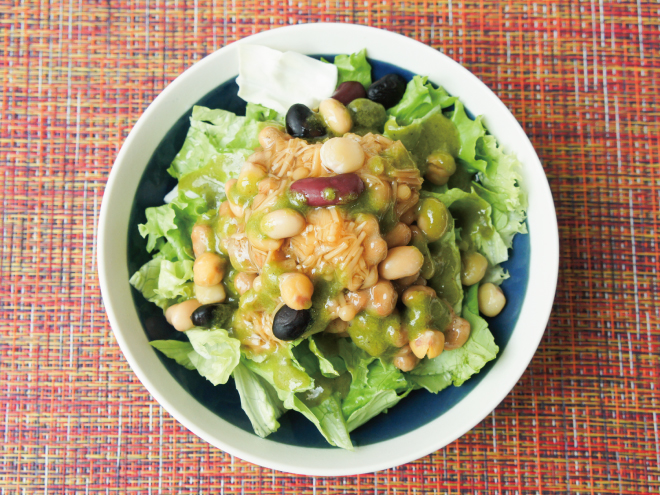 蒸し豆納豆なめ茸ルッコラサラダ 材料納豆(丹念納豆)、レタス、キャベツ、なめ茸、色どり蒸し豆、ルッコラドレッシング、オリーブオイル蒸し豆納豆なめ茸ルッコラサラダの作り方①レタスとキャベツは、食べやすい大きさに切ったら、器に盛りつけます。②オリーブオイル、よく混ぜた納豆をかけます。③なめ茸、色どり蒸し豆、ルッコラドレッシングをかけたら完成です。