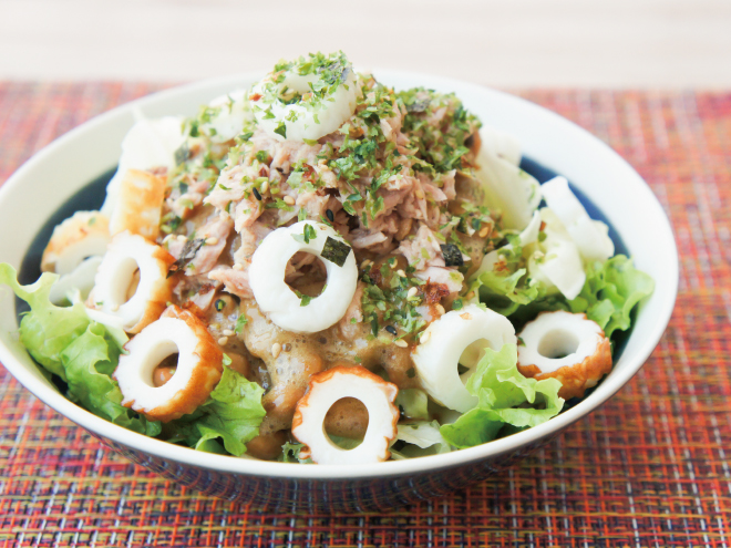 青のりワサビ納豆シーチキンちくわサラダ 材料納豆(丹念納豆)、レタス、キャベツ、シーチキン、ちくわ、青のり、わさびふりかけ、オリーブオイル、ポン酢青のりワサビ納豆シーチキンちくわサラダの作り方①レタスとキャベツは、食べやすい大きさに切ったら、器に盛りつけます。②オリーブオイル、ポン酢、よく混ぜた納豆をかけます。③シーチキンをのせたら、輪切りにしたちくわをのせます。④青のり、わさびふりかけをかけたら完成です。