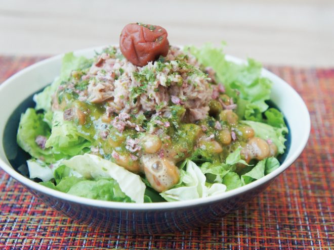 梅梅納豆青のりシーチキンルッコラサラダ 材料納豆(丹念納豆)、レタス、キャベツ、シーチキン、ルッコラドレッシング、梅、カリカリ梅ふりかけ、青のり、オリーブオイル梅梅納豆青のりシーチキンルッコラサラダの作り方①レタスとキャベツは、食べやすい大きさに切ったら、器に盛りつけます。②オリーブオイル、よく混ぜた納豆をかけます。③シーチキン、ルッコラドレッシングをかけたら、梅をのせます。④カリカリ梅ふりかけ、青のりをかけて完成です。
