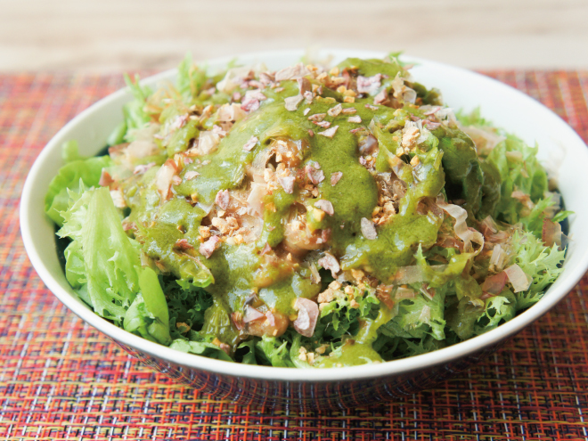 きなこ梅鰹納豆ルッコラサラダ 材料納豆(丹念納豆)、レタス、かつおぶし、ルッコラドレッシング、カリカリ梅ふりかけ、カリカリきなこ、オリーブオイルきなこ梅鰹納豆ルッコラサラダの作り方①レタスは、食べやすい大きさに切ったら、器に盛りつけます。②オリーブオイル、よく混ぜた納豆をかけます。③かつおぶし、ルッコラドレッシング、カリカリ梅ふりかけ、カリカリきなこをかけたら完成です。