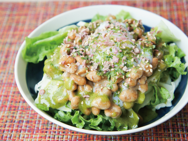 納豆(丹念納豆)、レタス、キャベツ、温泉卵、カリカリ梅ふりかけ、青のり、ごま、ルッコラドレッシング