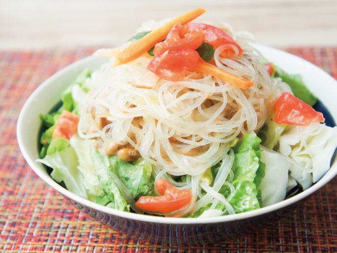 ⑥よく混ぜ合わせた春雨サラダをかけて完成です。