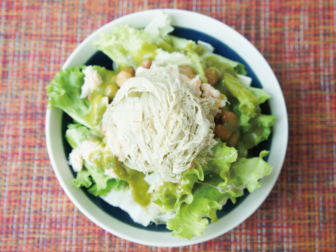 スパイス納豆蒸し鶏とろろ昆布ルッコラサラダ 材料納豆(丹念納豆)、レタス、キャベツ、蒸し鶏、とろろ昆布、万能スパイス、ルッコラドレッシング、オリーブオイルスパイス納豆蒸し鶏とろろ昆布ルッコラサラダの作り方①レタスとキャベツは、食べやすい大きさに切ったら、器に盛りつけます。②オリーブオイル、よく混ぜた納豆をかけます。③蒸し鶏をのせたら、とろろ昆布、万能スパイス、ルッコラドレッシングをかけて完成です。