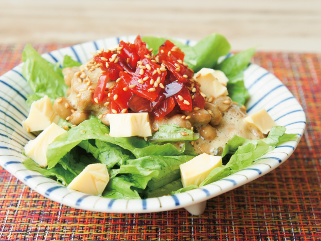 スモークチーズ納豆福神漬けサラダ 材料納豆(丹念納豆)、レタス、福神漬け、スモークチーズ、ごま、オリーブオイル、ポン酢スモークチーズ納豆福神漬けサラダの作り方①レタスは、食べやすい大きさに切ったら、器に盛りつけます。②オリーブオイル、ポン酢、よく混ぜた納豆をかけます。③福神漬け、スモークチーズ、ごまをかけたら完成です。