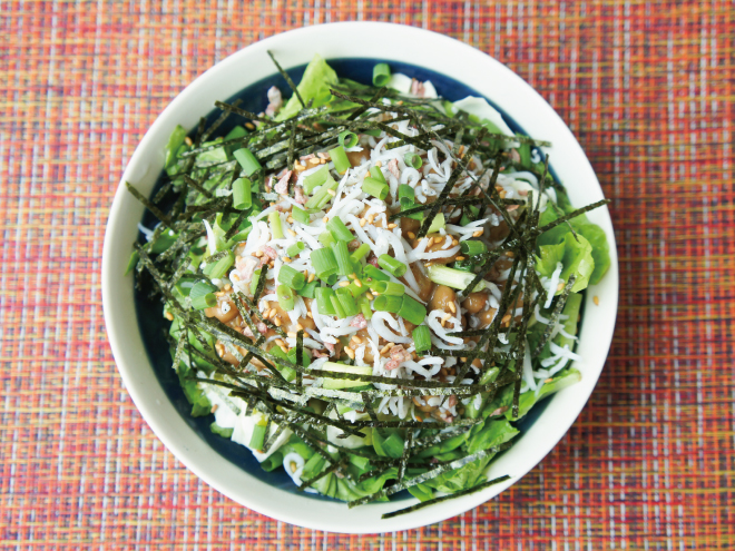 ネギちりめん梅海苔ごま納豆ルッコラサラダ 材料納豆(丹念納豆)、レタス、キャベツ、ちりめんじゃこ、ネギ、カリカリ梅ふりかけ、ごま、刻みのり、ルッコラドレッシングネギちりめん梅海苔ごま納豆ルッコラサラダの作り方①レタスとキャベツは、食べやすい大きさに切ったら、器に盛りつけます。②ルッコラドレッシング、よく混ぜた納豆をかけます。③ちりめんじゃこ、ネギ、カリカリ梅ふりかけ、ごま、刻みのりをかけたら完成です。