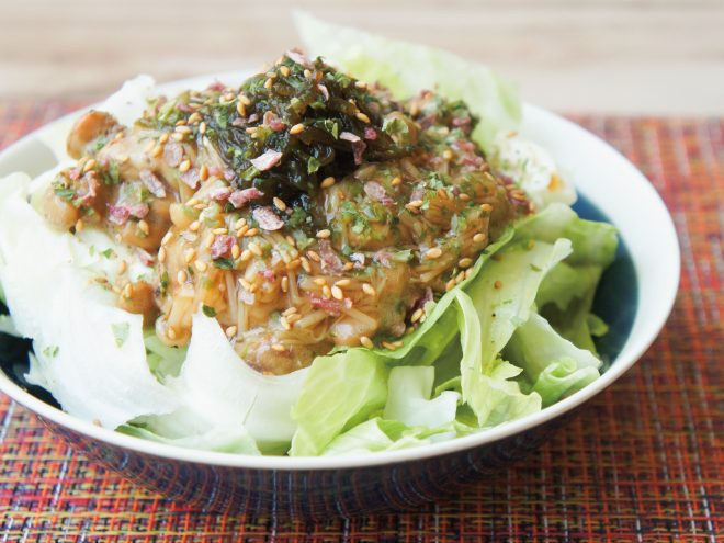 納豆なめ茸もずく梅のりサラダ 材料納豆(丹念納豆)、レタス、キャベツ、なめ茸、もずく、カリカリ梅ふりかけ、青のり、万能スパイス、オリーブオイル、ポン酢納豆なめ茸もずく梅のりサラダの作り方①レタスとキャベツは、食べやすい大きさに切ったら、器に盛りつけます。②オリーブオイル、ポン酢、よく混ぜた納豆をかけます。③なめ茸、もずく、カリカリ梅ふりかけ、青のり、万能スパイスをかけたら完成です。