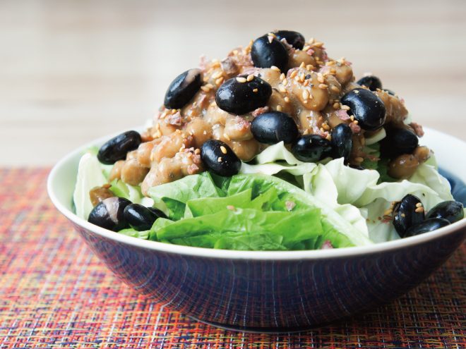黒煮豆と梅ごま納豆サラダ 材料納豆(丹念納豆)、レタス、キャベツ、黒煮豆、ごま、カリカリ梅ふりかけ、万能スパイス、オリーブオイル黒煮豆と梅ごま納豆サラダの作り方①レタスとキャベツは、食べやすい大きさに切ったら、器に盛りつけます。②オリーブオイル、よく混ぜた納豆をかけます。③黒煮豆、ごま、カリカリ梅ふりかけ、万能スパイスをかけたら完成です。