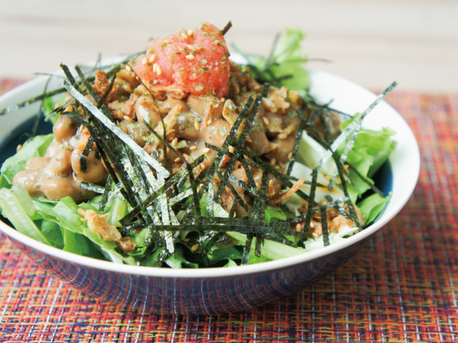 のりオニオン納豆明太子サラダ 材料納豆(丹念納豆)、レタス、キャベツ、フライドオニオン、明太子、刻みのり、ごま、オリーブオイル、ポン酢のりオニオン納豆明太子サラダの作り方①レタスとキャベツは、食べやすい大きさに切ったら、器に盛りつけます。②オリーブオイル、ポン酢、よく混ぜた納豆をかけます。③フライドオニオン、明太子、刻みのり、ごまをかけたら完成です。