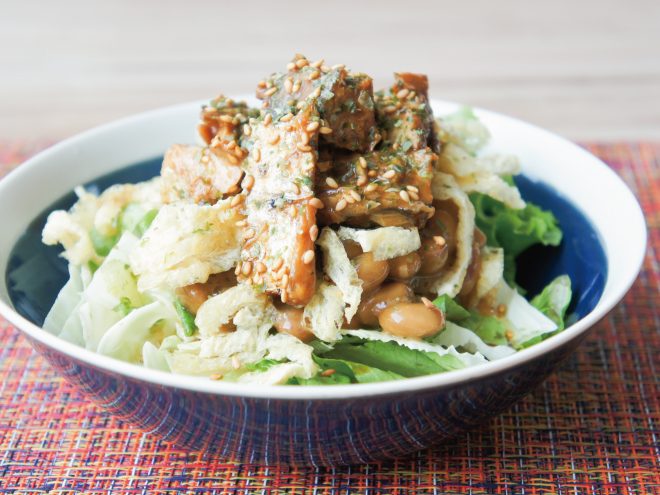納豆(丹念納豆)、レタス、キャベツ、きざみ油揚げ、炙りさばの味噌だれ缶詰、青のり、ごま、オリーブオイル、、ポン酢