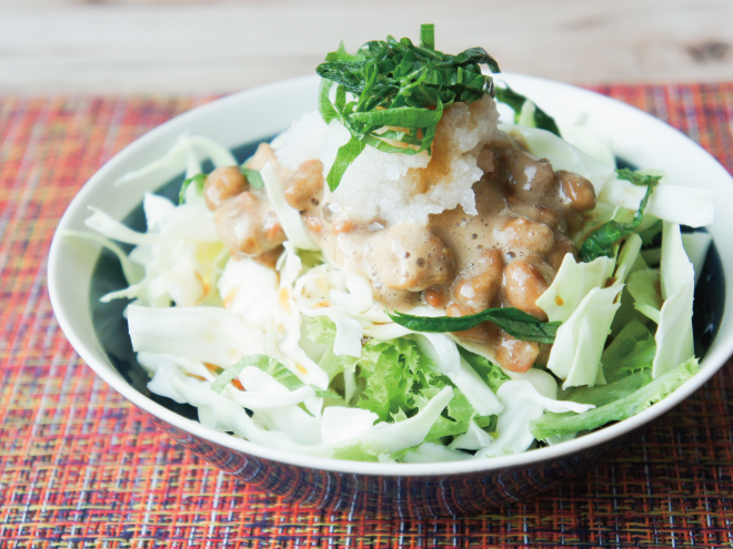 大根おろし納豆しそサラダ 材料納豆(丹念納豆)、レタス、キャベツ、大根おろし、刻みしそ、オリーブオイル、ポン酢大根おろし納豆しそサラダの作り方①レタスとキャベツは、食べやすい大きさに切ったら、器に盛りつけます。②オリーブオイル、よく混ぜた納豆をかけます。③大根おろし、ポン酢をかけたら、刻んだしそをのせて完成です。