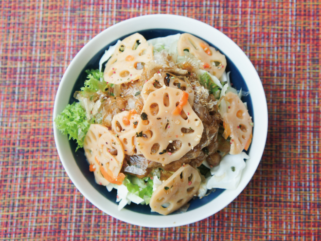 ③かつおぶし、ポン酢をかけたら、れんこんのきんぴらをのせます。