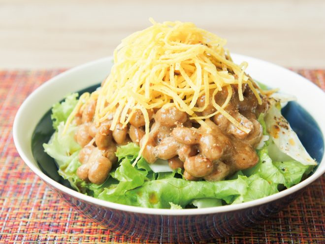 錦糸たまご納豆スパイスサラダ 材料納豆(丹念納豆)、レタス、キャベツ、錦糸たまご、万能スパイス、ポン酢、オリーブオイル錦糸たまご納豆スパイスサラダの作り方①レタスとキャベツは、食べやすい大きさに切ったら、器に盛りつけます。②ポン酢、オリーブオイル、よく混ぜた納豆をかけます。③錦糸たまご、万能スパイスをかけたら完成です。